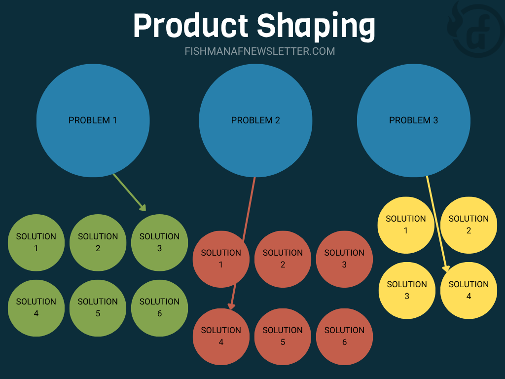But the very best companies like Apple, Stripe, and Amazon don’t actually work this way. They instead leverage a process known as product shaping. The idea here is they come up with a bunch of potential customer problems to solve and then immediately start prototyping solutions to those problems. They then prioritize what to put on their roadmap based on the best problem/solution pairs. This way they know that they are not only solving an acute problem for a customer, but also solving it with a solution that is likely to resonate strongly as well.