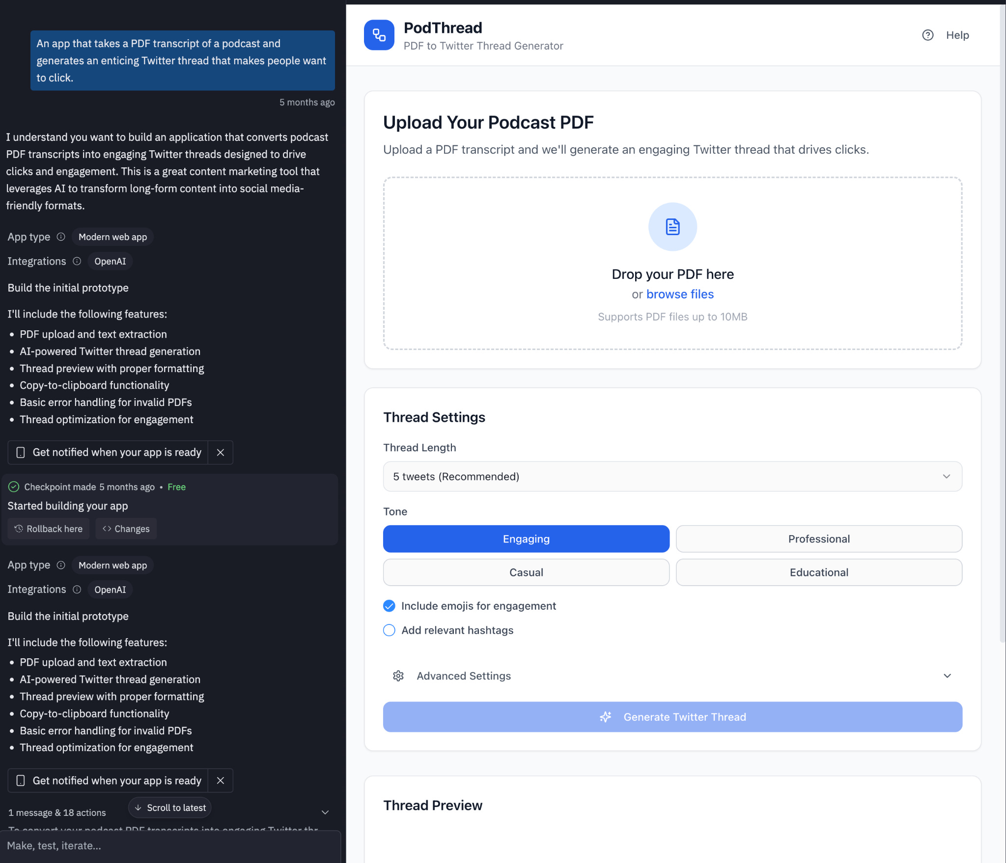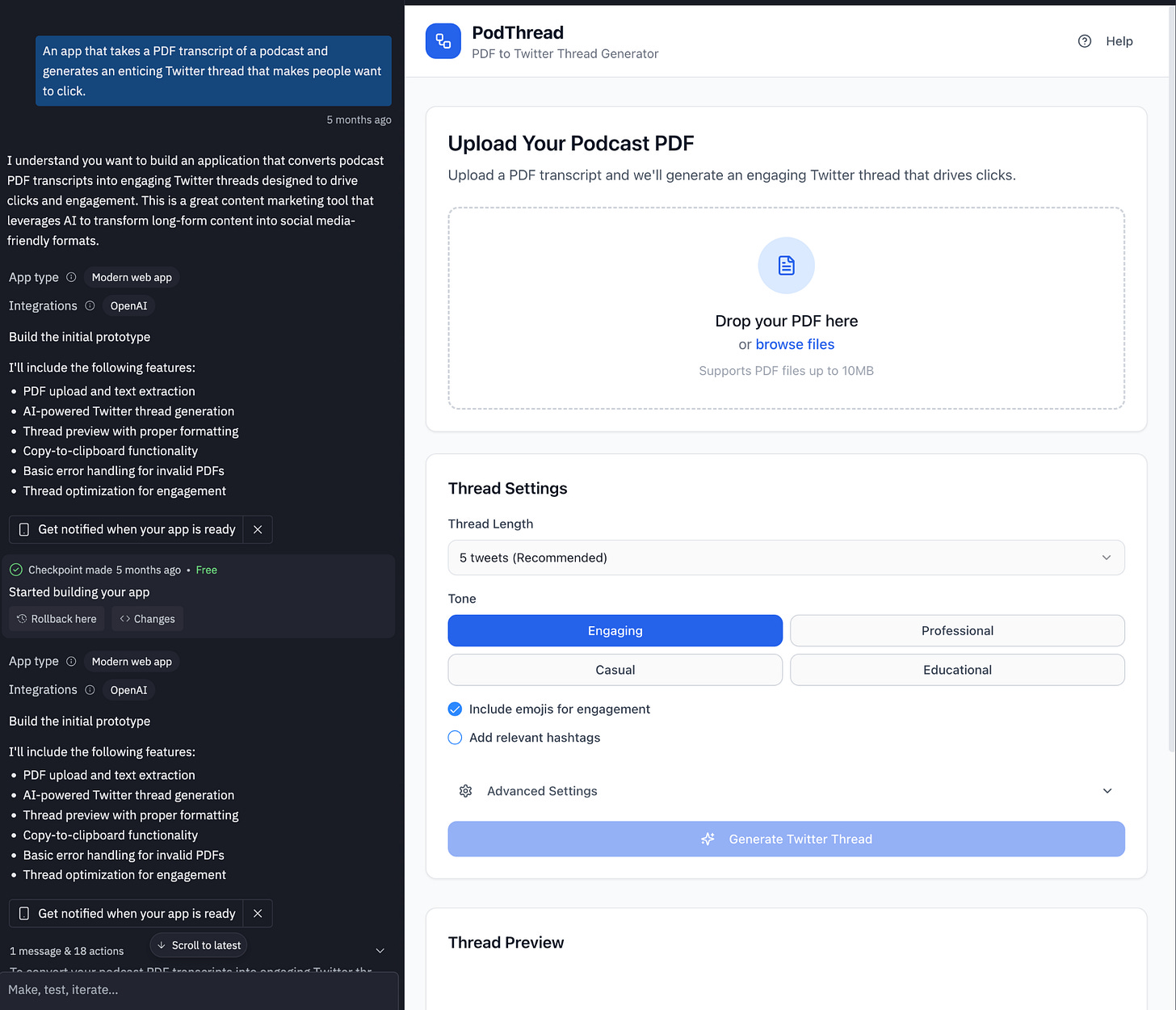 Editor note: here’s a podcast transcript to tweet-thread generator I built in a couple of turns with Replit: