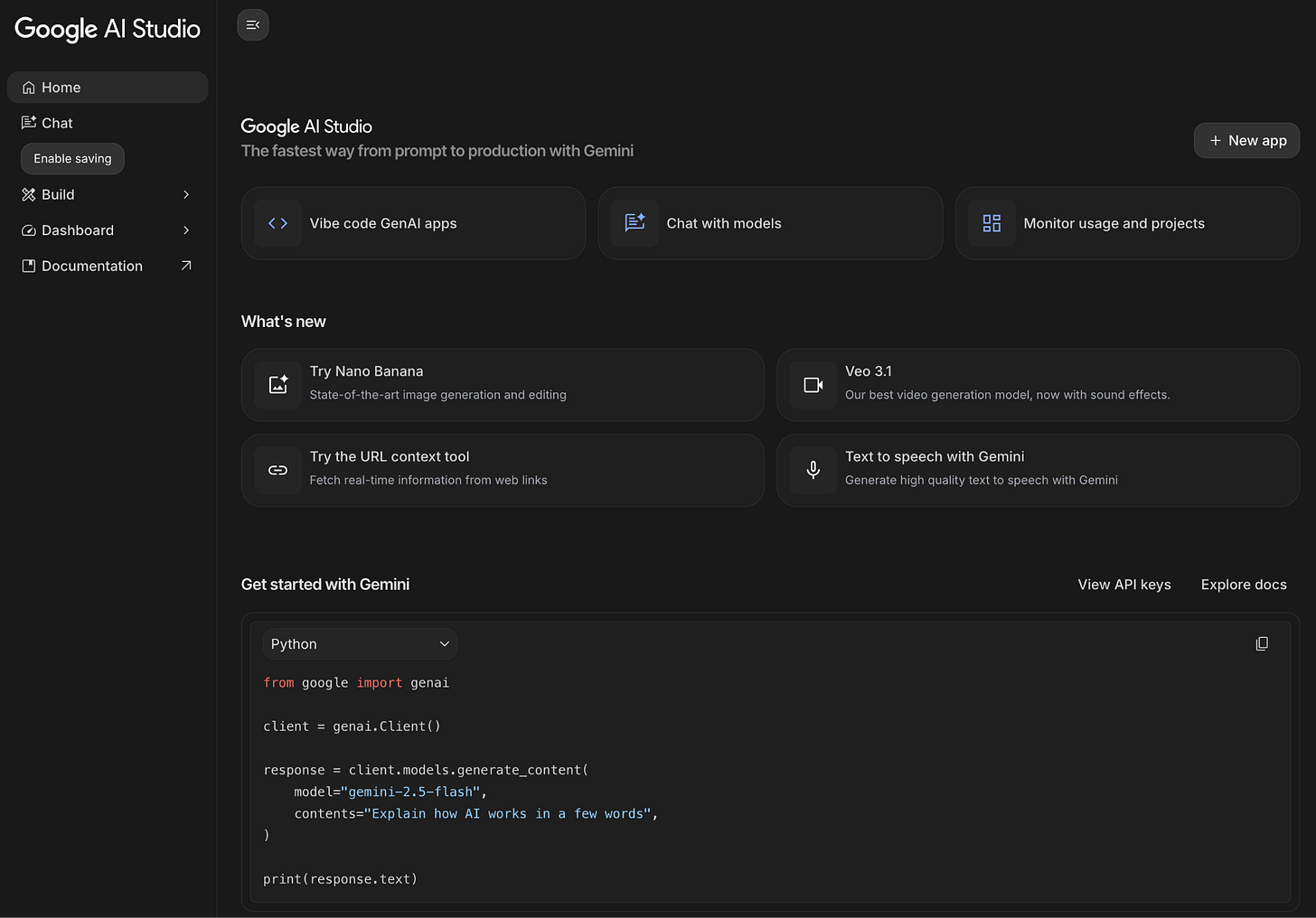 Google AI Studio is a newer app builder from Google that differentiates based on its focus on helping you build AI apps using Google’s AI technologies, including Gemini for text, Nano Banana for image, and Veo for video generation. Though it’s less focused on helping you build full-stack applications.