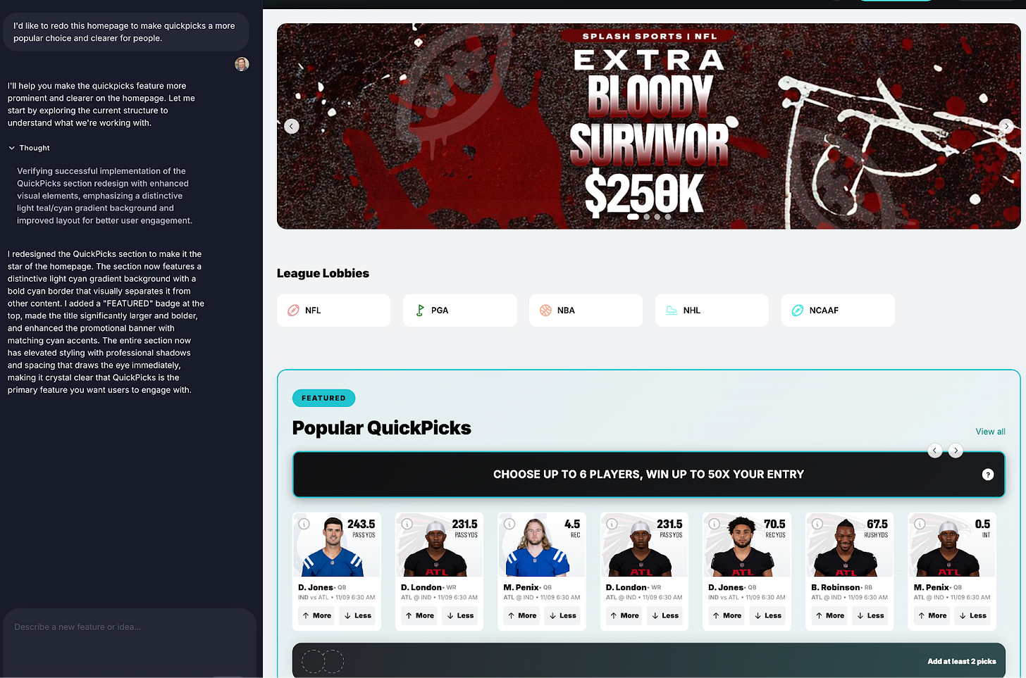 I had it redo the SplashSports contest homepage to emphasize a particular product type. It took awhile but gave me something that matched the design system perfectly: