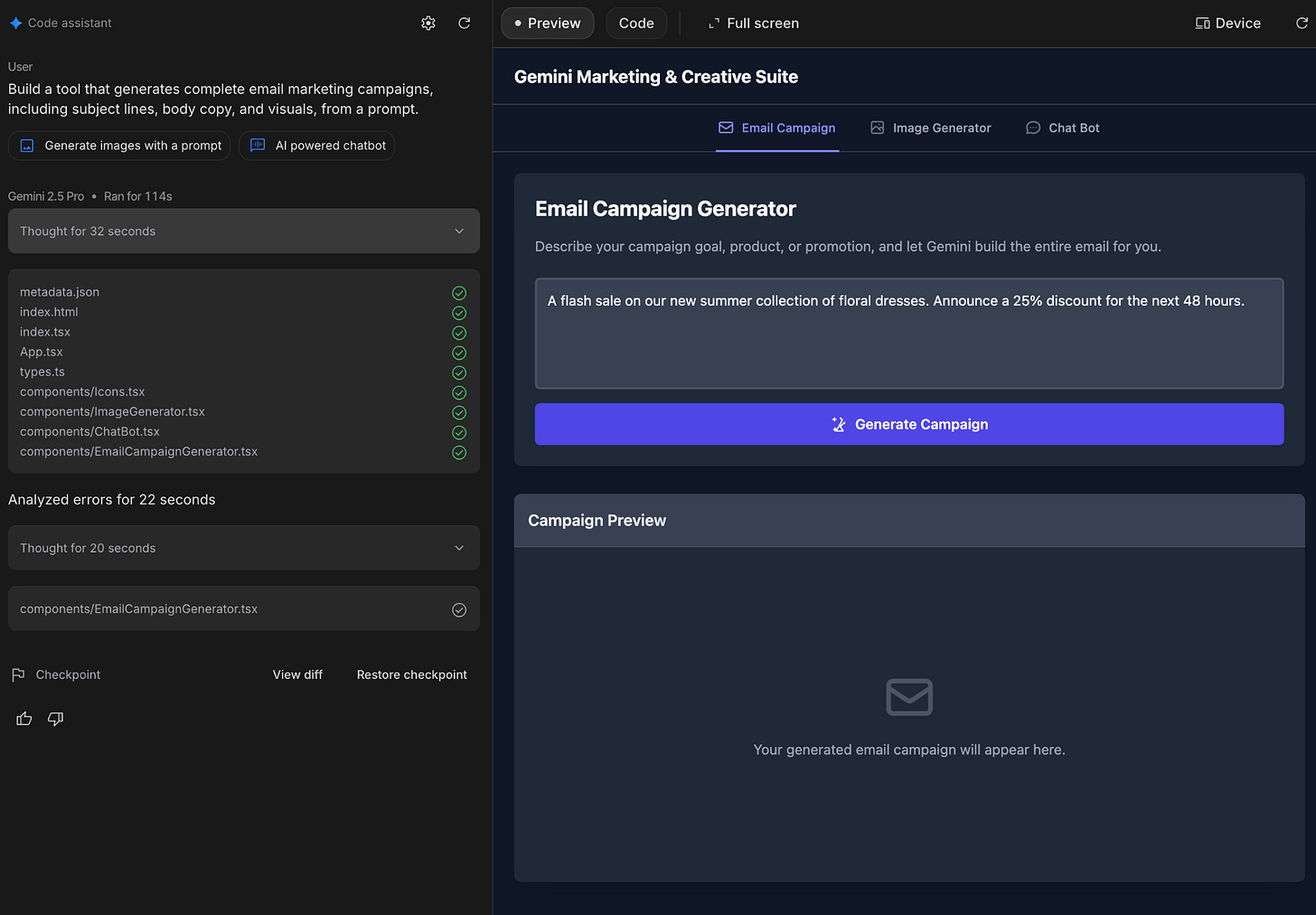 Here’s a prototype of a tool that builds email marketing campaigns from a single problem; built in <2 minutes: