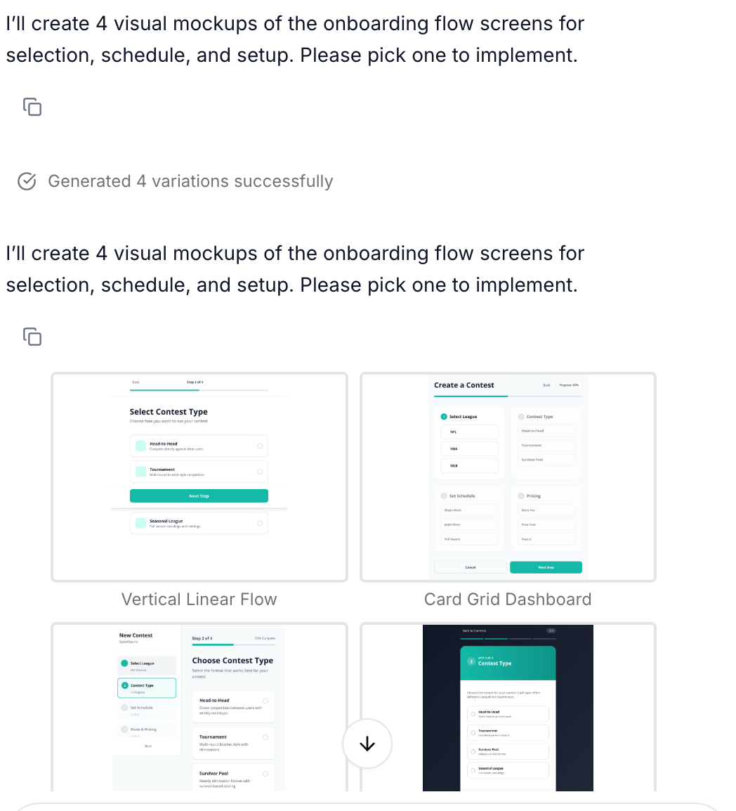 I used the Variants feature to generate 4 alternative setup experiences for SplashSports contest creation: